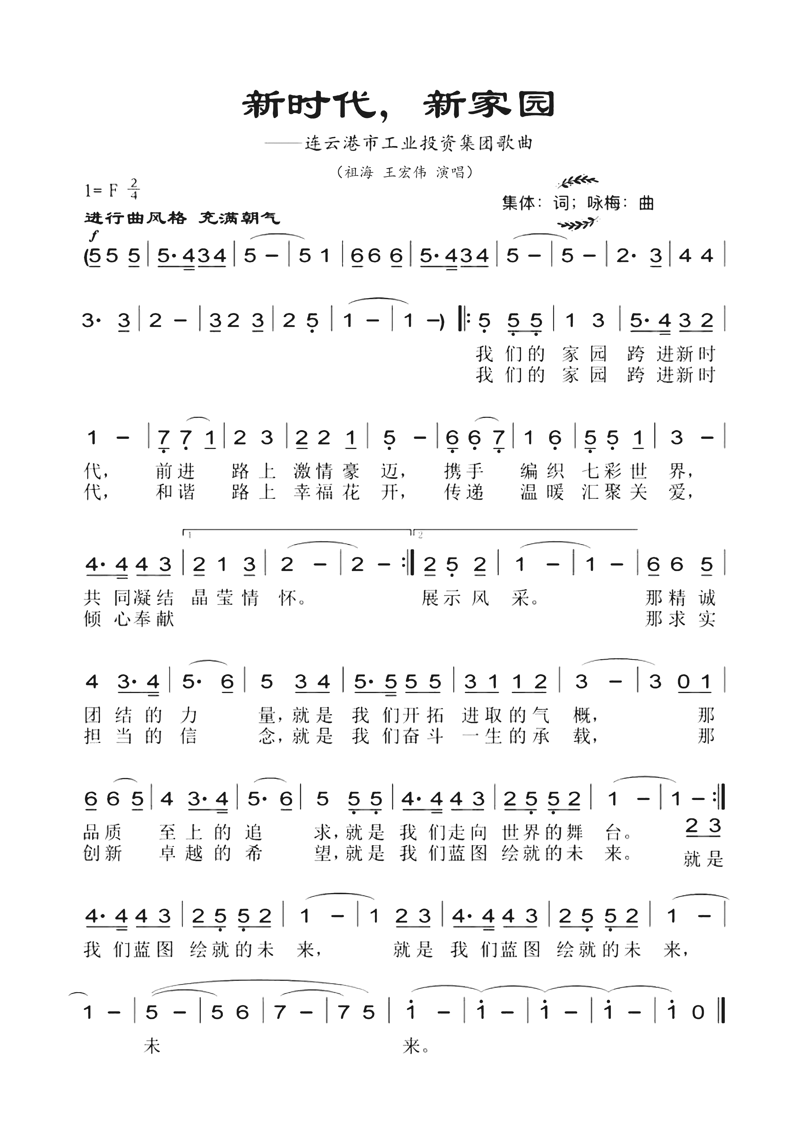 司歌以簡捷易懂的詞語融入了集團公司企業文化的主體思想,歌頌了工投人的精神面貌,暢想了工投集團的遠大目標。其曲調簡單易唱、鏗鏘有力,適宜于有音樂基礎和無音樂基礎的所有員工學唱。