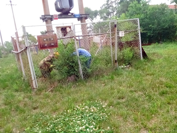 清理外置的變電設(shè)備周圍環(huán)境。通過夏季雨水的滋潤,外置的變電設(shè)備周圍長滿了鹽蒿、蔓草和蘆葦。有的地方雜草叢生人不能進(jìn)入給維護造成困難,有的地方蔓草越過圍欄直接爬上電桿威脅線路安全,有的直接被淹沒在蘆葦叢中,不見了蹤影,給變電設(shè)備的環(huán)境帶來惡化和安全隱患。為此,供電所組織人員進(jìn)行全面清理,完成了16處外置的變電設(shè)備清理工作。