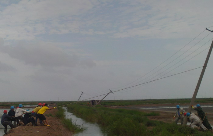 8月3日天剛亮,大家都顧不上休息,立即分片趕到受災(zāi)現(xiàn)場巡視情況。東港工區(qū)洋井口8根高壓桿被刮倒,大瑞頭圩、二圩、新灘口和方南、嚴港等工區(qū)30多根低壓桿被刮歪,有的倒在了格堰上,情況十分危急。搶修人員立即作了停電應(yīng)急處理,確保安全。