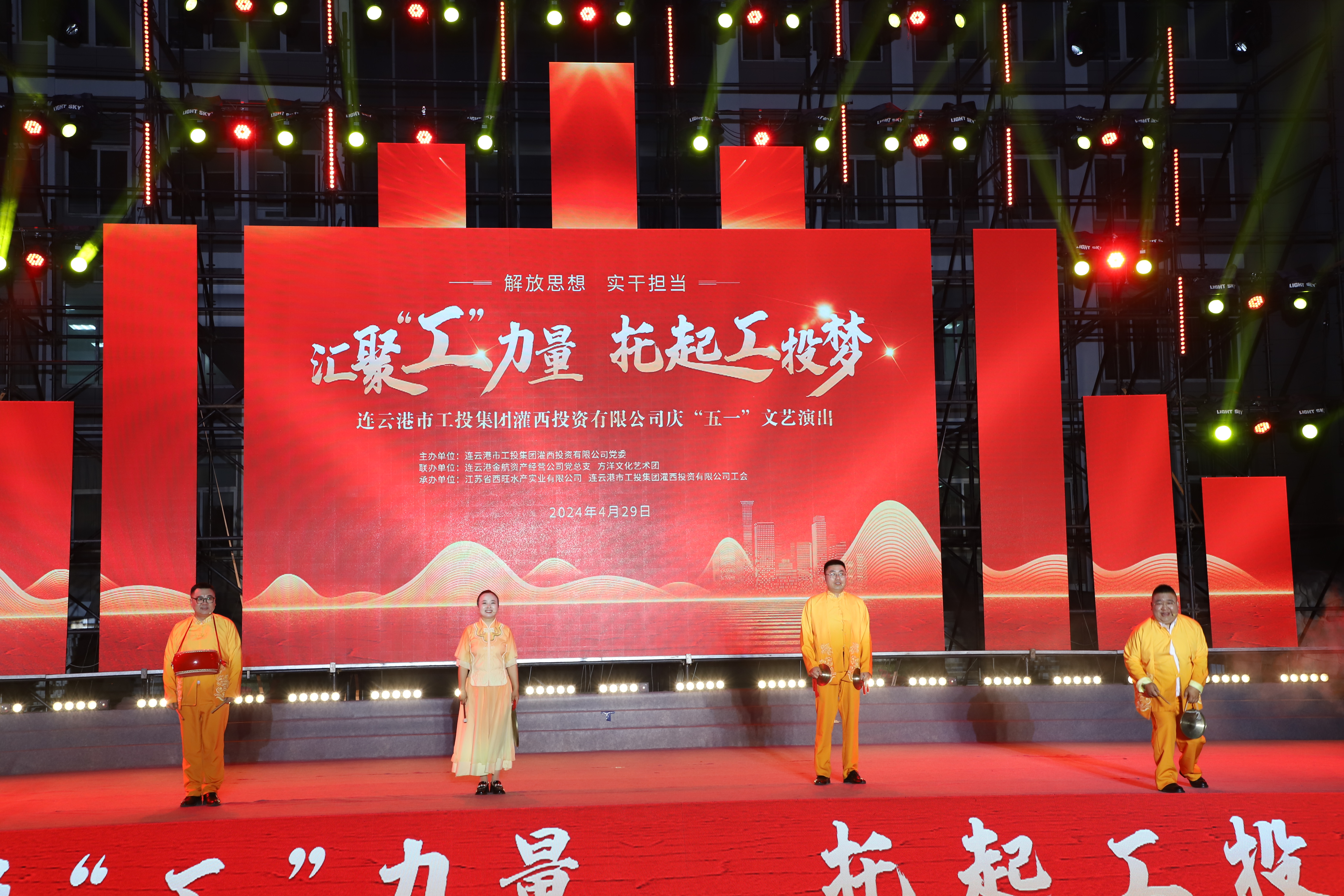 4月29日晚,灌西投資公司《匯聚“工”力量,托起工投夢》慶“五一”文藝演出在機(jī)關(guān)大樓前廣場舉行。本次活動(dòng)由灌西投資公司黨委主辦,連云港金航資產(chǎn)經(jīng)營公司黨總支、方洋文化藝術(shù)團(tuán)聯(lián)辦,旨在通過藝術(shù)的形式,營造崇尚勞模、學(xué)習(xí)先進(jìn)、尊重勞動(dòng)的良好氛圍,豐富公司員工的文化生活,激發(fā)干事創(chuàng)業(yè)熱情。集團(tuán)公司領(lǐng)導(dǎo)張六林、戴鴻鳴、汪群及部分部門負(fù)責(zé)人,灌西、金航資產(chǎn)經(jīng)營公司領(lǐng)導(dǎo)班子成員出席演出活動(dòng),縣臨港產(chǎn)業(yè)區(qū)管委會(huì)、華能灌云清潔能源發(fā)電責(zé)任有限公司、徐圩新區(qū)方洋集團(tuán)等有關(guān)領(lǐng)導(dǎo)受邀觀看演出。