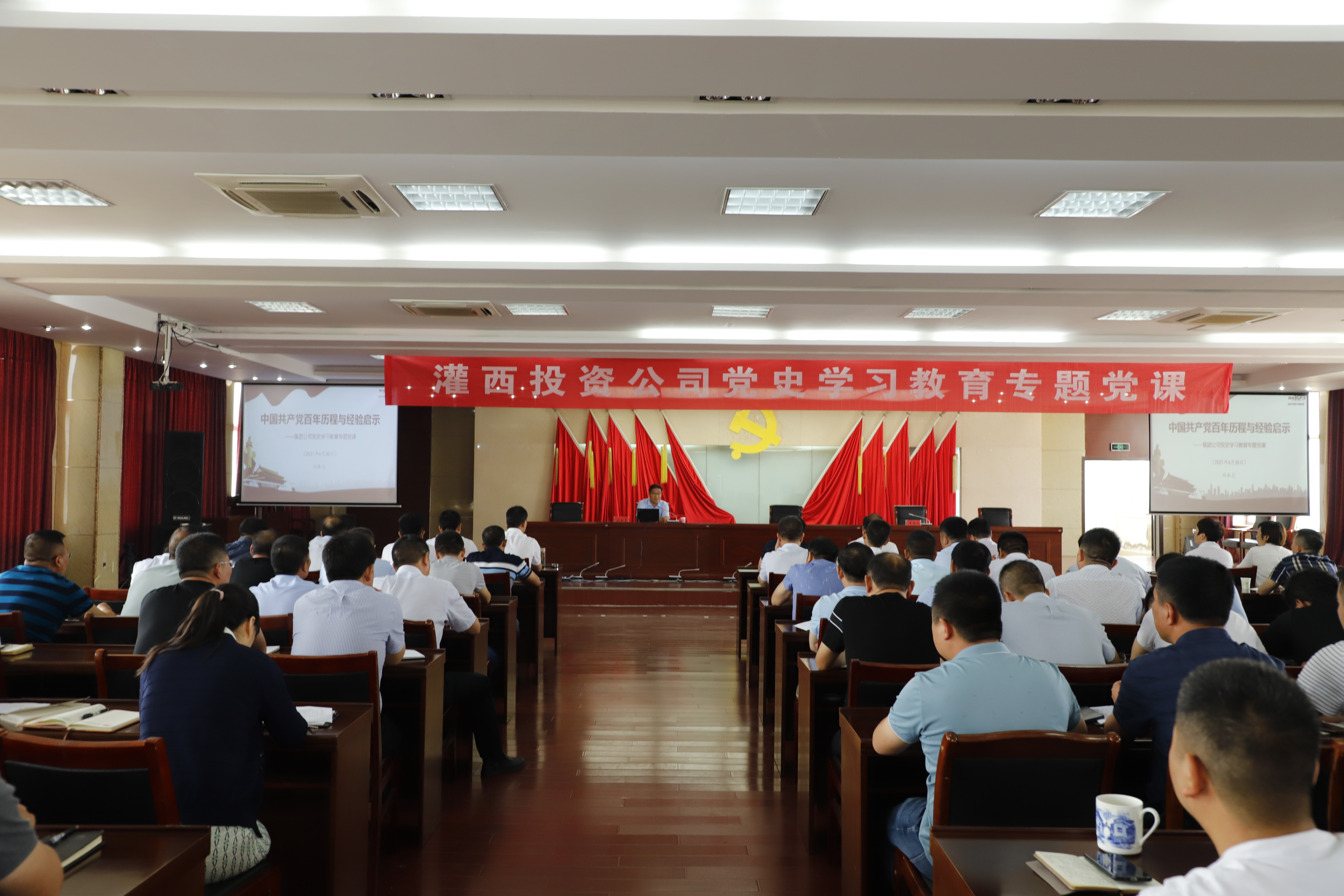 按照集團公司統(tǒng)一安排部署,推進黨史學習教育走深走實,6月30日上午,灌西投資公司舉辦黨史學習教育專題黨課學習會。集團工會主席劉承志以“中國共產(chǎn)黨百年歷程與經(jīng)驗啟示”為題專題授課。投資公司領導班子成員、各單位黨政負責人、機關全體黨員參加學習。灌西投資公司黨委書記、董事長、總經(jīng)理李國文主持會議。