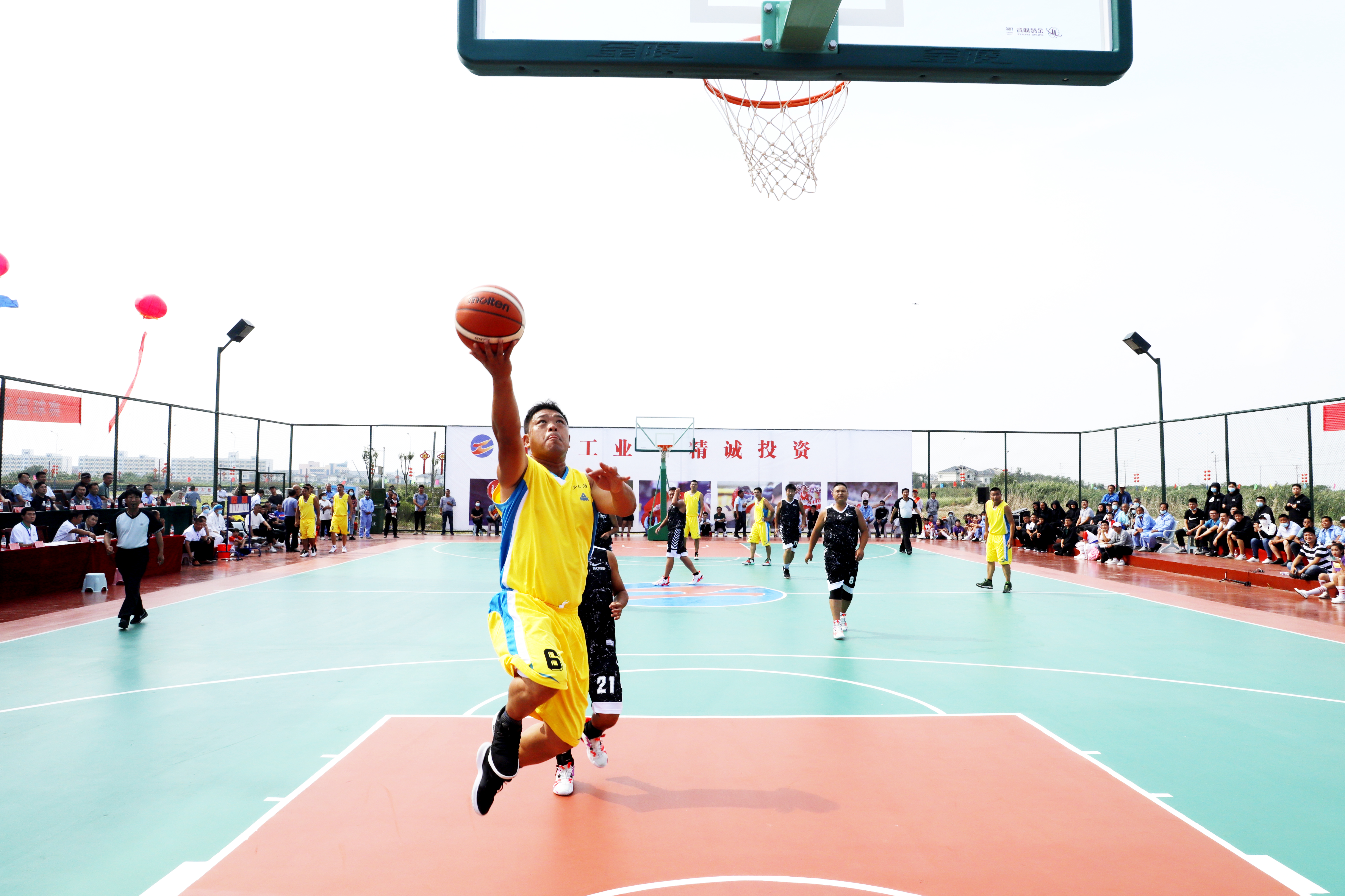 下午最后一場比賽是金橋制鹽公司對戰資產公司,首節比賽兩隊互有攻防,金橋制鹽代表隊5號,行動迅速,利用快攻屢屢得分,21號身強體強壯主攻籃下,21:1結束半場;下半場資產隊積極組織進攻,雖然分數落后,但是依然不放棄,敢打敢拼,利用遠投補足籃板弱項,最后還是以14:47敗北。(靳靜)