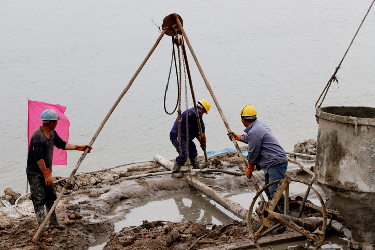 5月30日下午,藍(lán)色的天空沒有一絲云彩,火熱的太陽炙烤著大地。在灌西投資公司五灌河碼頭擴(kuò)建項(xiàng)目建設(shè)工地,施工人員正在各司其職的工作著,有的在使用電鋸,有的在壓鋼筋,還有的在焊接鋼筋框架。遠(yuǎn)處一臺混凝土澆灌機(jī)在進(jìn)行混凝土澆灌作業(yè),碼頭岸邊大小打樁機(jī)器一字排開,筆者親身感受五灌河碼頭二期工地開發(fā)建設(shè)的火熱場面。