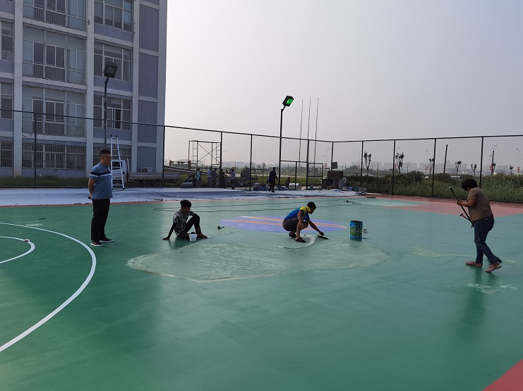 灌西籃球場總面積約510平米,附屬球場地面600平米,外圍護欄高3米。項目圍繞關鍵節點及重難點,強化施工組織,統籌施工進展?;@球場地面露天暴曬,溫度極高,仿佛蒸籠一般。施工人員在進行鑿地、涂漆時,僅幾分鐘的功夫,衣服從里到外被汗水浸濕,隨時有中暑的可能性,項目組把責任明確到個人,開展班前安全教育活動,保證施工安全。施工單位南翼工程公司負責人錢明偉克服人員緊缺,工期緊迫等問題,頂著高溫,始終奮戰在工程項目第一線。