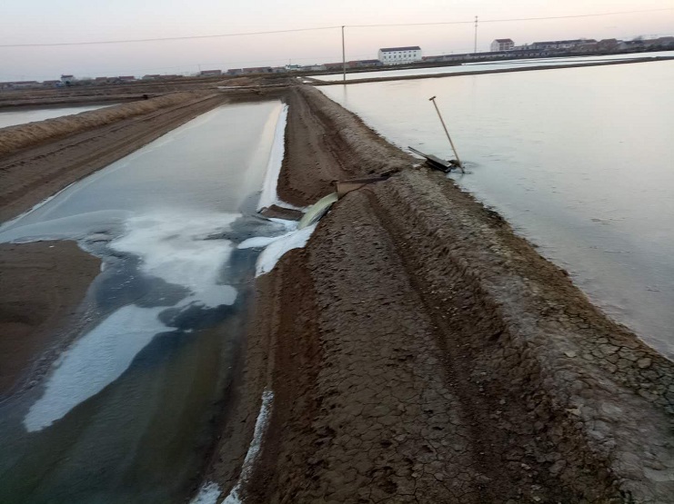 近日,氣溫低至零下八、九度,實業公司柴門區海鹽基地三個班組進行冰下抽咸制鹵。三個班組之前已做好了抽咸的準備工作。班組長清早六點鐘頂著低溫冰凍天氣抽咸:一班抽咸鹵水八千方,二班三千方,三班二千五百方,共計一萬三千五百方。最后做好凍化水排淡工作。(實業公司)