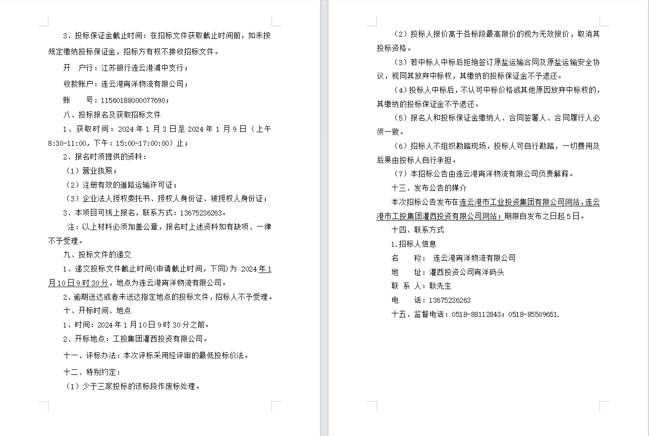 連云港宵洋物流有限公司原鹽車輛 異地轉運業務招標公告(二次)