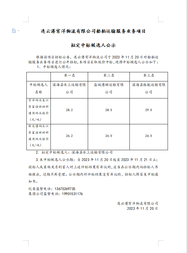 連云港宵洋物流有限公司船舶運輸服務業務項目擬定中標候選人公示