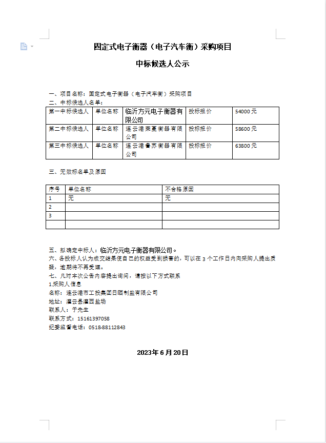 固定式電子衡器(電子汽車衡)采購項目 中標候選人公示