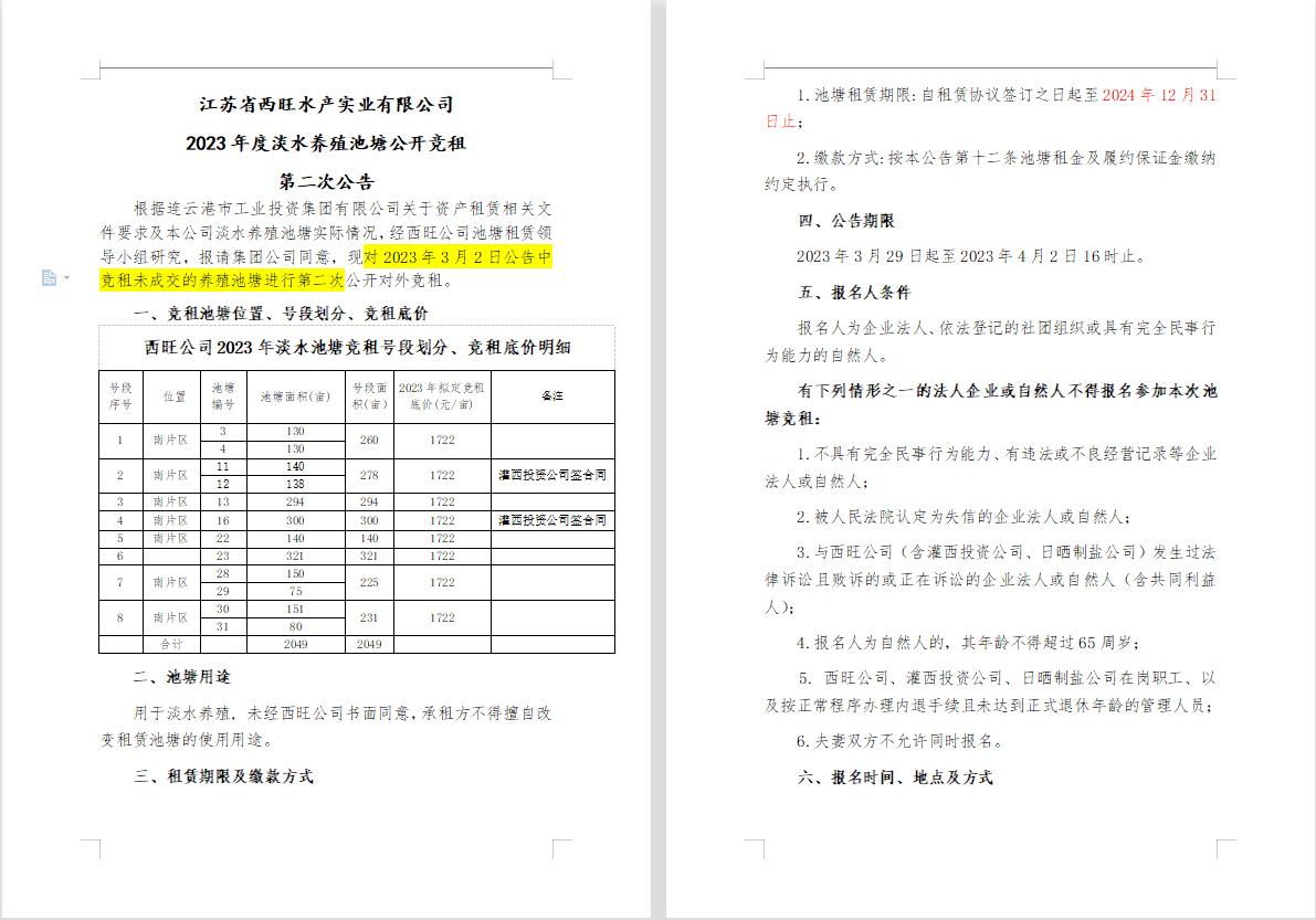 江蘇省西旺水產實業有限公司2023年度淡水養殖池塘公開競租第二次公告