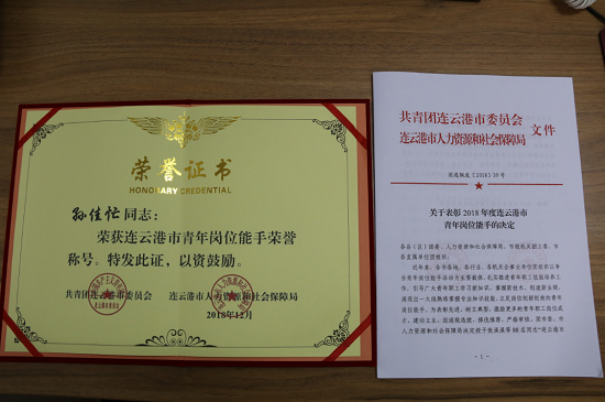格斯達擔保公司業(yè)務一部副經(jīng)理、贛榆分部副經(jīng)理孫佳忙同志,榮獲2018年度連云港市“青年崗位能手”榮譽稱號。