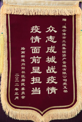 非常感謝你們對我們社區的守護,為我們居民筑牢了疫情‘防護墻’,你們辛苦了!”5月16日下午,路南街道向陽社區居委會書記王婷一行,專程來到資產公司送來一面印有“眾志成城戰疫情,疫情面前顯擔當”的錦旗,代表社區居民向資產公司黨支部今年疫情期間援助向陽社區中所作貢獻表示敬意和感謝。