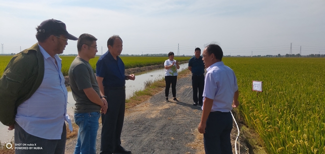9月24日中午,江蘇省農業(yè)科學院蘇北科技服務中心主任楊四軍研究員一行到大新農場察看“優(yōu)香粳”水稻的生長情況,與農場負責人及條田工就優(yōu)香粳當前生長情況及生長后期的注意事項提出了指導性建議。優(yōu)香粳是由省農科院提供的優(yōu)質稻米品種,曾在2018年上海優(yōu)質稻米品鑒會獲金獎。(劉 楊)