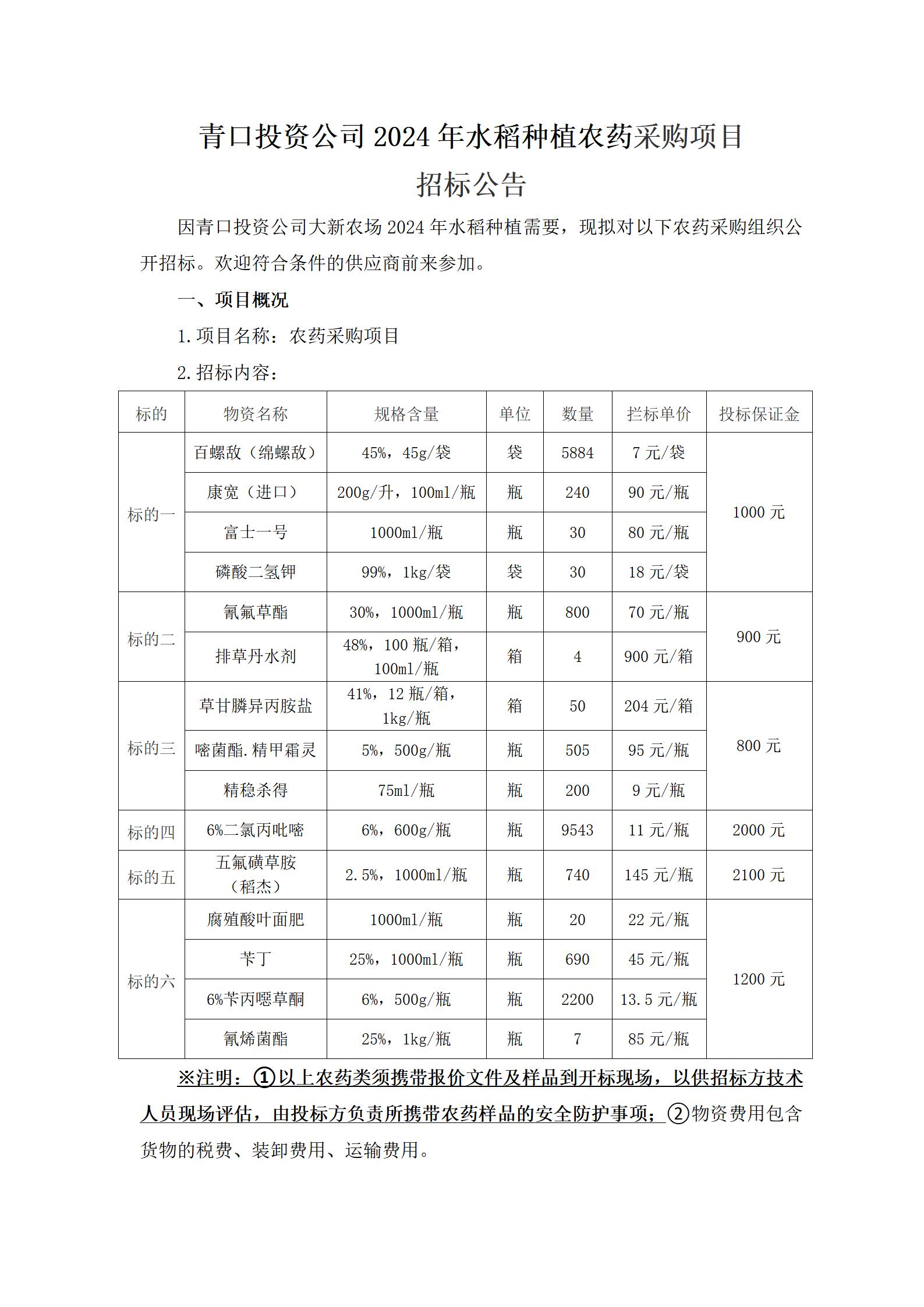 青口投資公司2024年水稻種植農(nóng)藥采購項目 招標公告