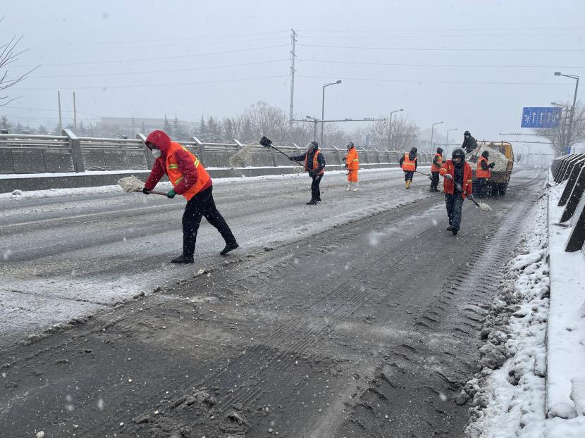 自2月2日以來,裕升養護分公司接到掃雪除冰緊急通知后積極響應,迅速調配人員和物資,等待暴雪降臨。在負責人霍正鋼的帶領下,公司第一時間成立應急搶險隊,這是一支由12名隊員,平均年齡在57歲所組成的隊伍,更是一支“特別能吃苦、特別能奉獻、特別能擔當”的隊伍。雪花于晚次日11點飄然而至,霍正鋼密切關注雪量以及積雪狀況,并做好指揮部署,同時通知各隊員立即開展道路掃雪除冰工作。