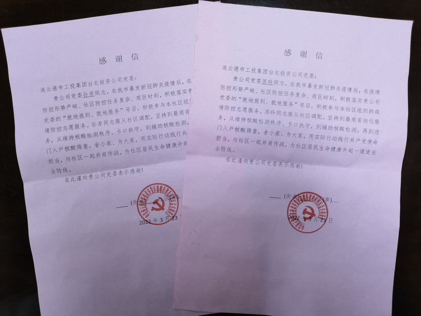 “臺北投資公司的黨員同志們視疫情防控為己任,服從調(diào)度安排,站好每一班崗,不僅認(rèn)真履行防控職責(zé),又創(chuàng)新開展疫情防控教育宣傳、便民服務(wù)等多項(xiàng)活動,成為我們社區(qū)防疫攻堅(jiān)的主力軍。”325日,收到開發(fā)區(qū)猴嘴街道昌圩社區(qū)送來的一份特殊的“禮物”— 一封疫情防控感謝信,感謝臺北投資公司黨員蘇玲、孫芳等同志在新冠肺炎疫情防控的關(guān)鍵階段挺身而出、伸出援手,參與協(xié)助社區(qū)的疫情防控工作。