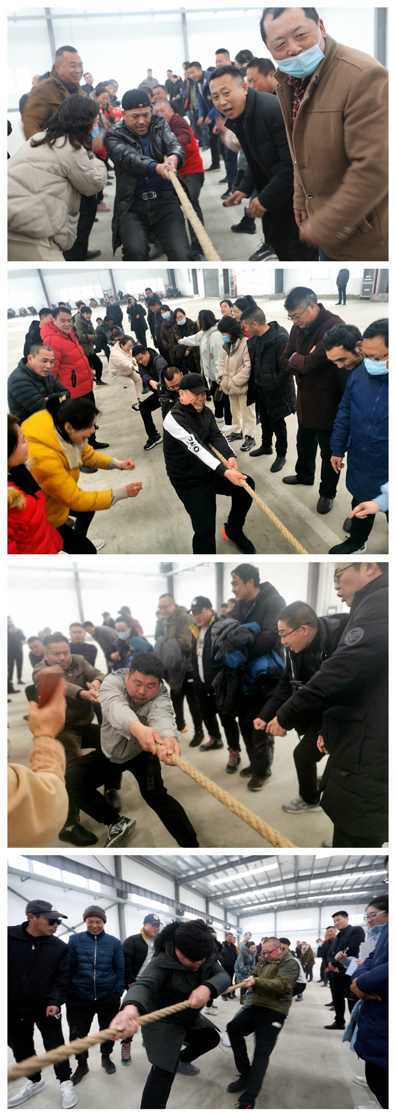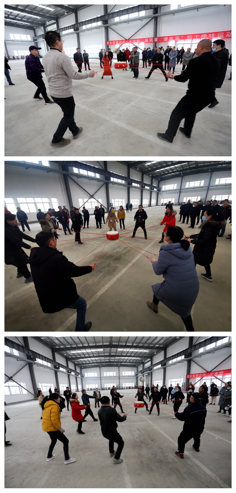 陽光熹微,冬日似金。為喜迎2021年新年的到來,大力弘揚(yáng)團(tuán)結(jié)拼搏,昂揚(yáng)向上、奮發(fā)有為的精神風(fēng)貌,營造生動(dòng)活潑、寬松和諧、積極健康的良好氛圍,12月28日下午,投資公司在海州灣公司9號(hào)廠房舉辦“慶豐收、展風(fēng)采、譜新篇”迎元旦職工趣味運(yùn)動(dòng)會(huì)。本次趣味運(yùn)動(dòng)會(huì)分為拔河、同心擊鼓、企鵝漫步、快樂點(diǎn)球等四個(gè)項(xiàng)目,分為兩天舉行,本日舉行拔河、同心擊鼓兩項(xiàng)比賽。