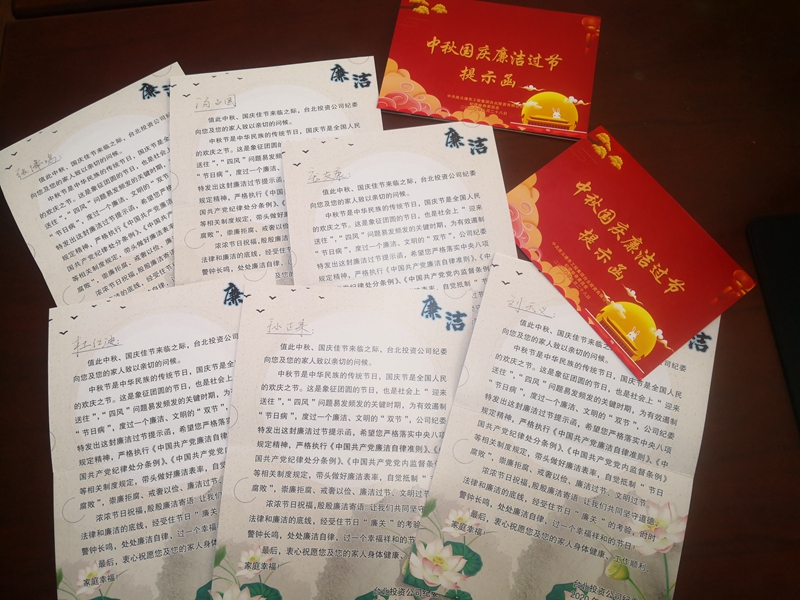 溫馨提示函早提醒。“值此中秋、國(guó)慶佳節(jié)來臨之際,臺(tái)北投資公司紀(jì)委向您和您的家人致以親切的問候……時(shí)時(shí)警鐘長(zhǎng)鳴,處處廉潔自律,過一個(gè)幸福祥和的節(jié)日!”節(jié)前,公司通過廉潔提示函向黨員領(lǐng)導(dǎo)干部贈(zèng)送節(jié)日廉潔提醒,將廉潔過節(jié)的紀(jì)律要求融入節(jié)日祝福。