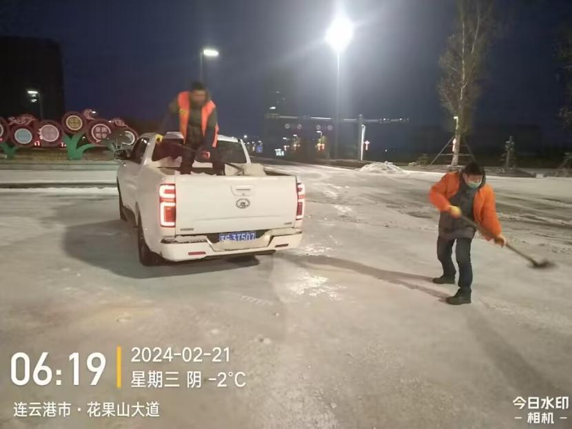 凌晨3點(diǎn),葛中仁、孫銀、薛興華、伏廣軍奮戰(zhàn)在花果山大道除雪現(xiàn)場,由于冰凍嚴(yán)重、路面濕滑,工程車行進(jìn)過程中舉步維艱,他們互相配合、齊心協(xié)力,時(shí)刻關(guān)注路面情況,確保道路無積雪、無結(jié)冰。