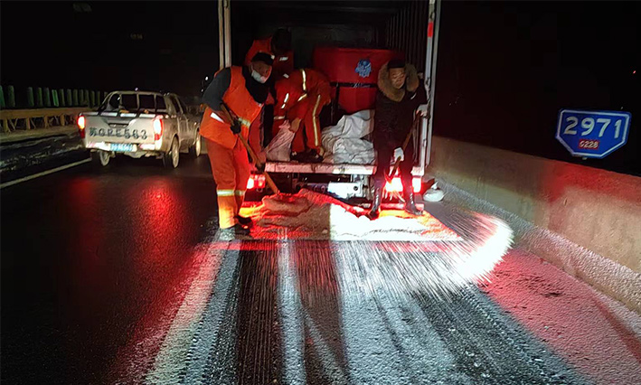 該公司除雪突擊隊由總經理徐習華和副總王利分頭帶隊指揮,集結了安全部、管養部、綠化、保潔、市政、環衛的突擊隊員80余名,出動5輛皮卡車、3輛皮卡、1臺裝載機和2輛巡查車,主要負責新區內橋梁、連云開發區橋梁、徐新路、疏港大道、228省道等主要交通干道布撒融雪劑抗凍救災工作。突擊隊員在進行融雪劑撒布作業的同時,及時清理路面融化雪水,防止再次結冰,各除雪設備配合作業,階梯式向前推進,提高除雪效率。(李敏 王宜全)
