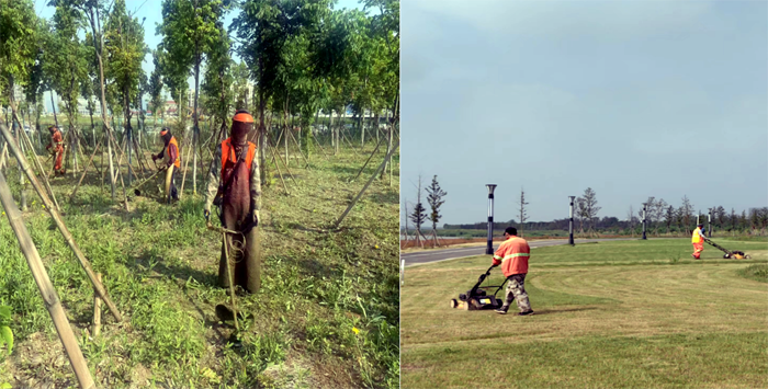 早上6:30,班組兵分三路。班長(zhǎng)田恒亮帶領(lǐng)一組工人用草坪機(jī)修理草坪;協(xié)管員葛成東帶另一組工人用割灌機(jī)清除雜草;對(duì)于不便用機(jī)器清除的區(qū)域,第三組工作人員采取用手拔除方法,確保各區(qū)域雜草清理不留死角。