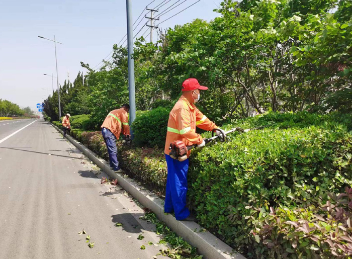 ????? 強化綠化修剪結合季節特點和植物生長習性,對行道樹及綠籬展開整形修剪,及時去除枯死枝、折斷枝、病蟲枝及下垂枝,確保樹形優美,生長態勢良好。本著除早、除小、除了的原則,對枯草雜草及時清理,防治雜草與園林植物爭肥、爭水,確保苗木生長旺盛。